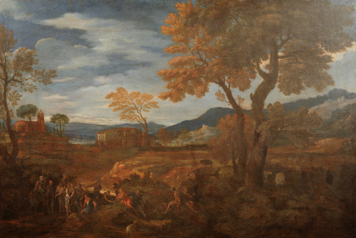 - NOTIZIE STORICO CRITICHE La tela è frutto della collaborazione di Crescenzio Onofri, autore del paesaggio, e di Pier Dandini, responsabile delle figure. L'opera è forse da identificare con un dipinto registrato nell'inventario redatto alla morte del Gran Principe Ferdinando (1713) insieme a un altro di mano degli stessi artisti raffigurante il "Ritrovamento di Mosè": "Due simili alti braccia 1 /3 larghi braccia 2 1/2, dipintovi di mano de' suddetti [ovvero Crescenzio Onofri e Pier Dandini] paese, che in uno vi sono molte figure, cameli e pecore et in lontananza vedute di casamenti, rappresenta Gioseffo ebreo venduto da i fratelli e nell'altro il ritrovamento di Mosè in braccio ad una femmina in atto rapresentarlo [c. 59v] alla regina Didone [sic] che è sopra di un carro tirato da due cavalli, con altre figure et animali di bovi e pecore presso di un fiume, con adornamento tinto di giallo e filettato d'oro, con cordone e nappa di filaticcio rosso e giallo" (ASFi, Guardaroba Medicea 1222, c. 59r.v). E' tuttavia da segnalare una certa discrepanza nelle misure, comprensive probabilmente della cornice. I toni azzurri e ruggine che contraddistinguono il dipinto sono tipici del momento fiorentino più avanzato dell'Onofri, non oltre comunque il 1712, anno di morte del Dandini. La tela è stata concessa in deposito alla Camera dei Deputati nel 1926