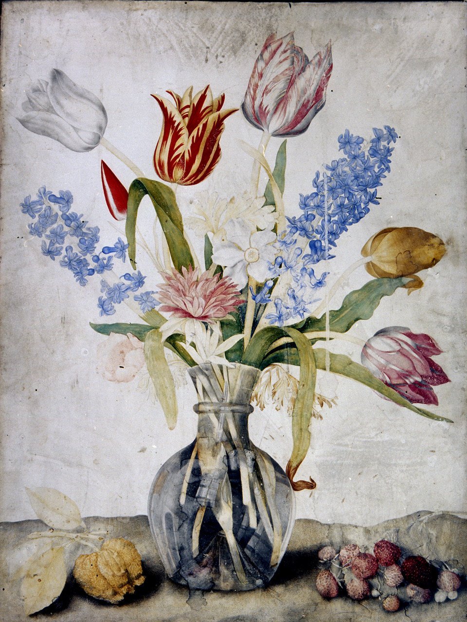- NOTIZIE STORICO CRITICHE La miniatura, in deposto presso la Camera dei Deputati dal 1925, si distingue per le notevoli dimensioni (cm 55 x 41 senza cornice). L'opera fece parte della collezione di dipinti custodita da Vittoria della Rovere nella sua villa del Poggio Imperiale. Come testimonia l'inventario della residenza della granduchessa stilato nel 1691 (ASF, Guardaroba Medicea 992, c. 32r) essa era custodita nella stanza dell'Aurora a pendant di un altro esemplare, oggi non rintracciato, raffigurante un'altra "guastada", ovvero un vaso di vetro, con ai piedi un "limon grosso partito", mandorle, e una passera in atto di beccare granaglie. Circondavano le due opere altre quarantasei miniature della stessa autrice. La composizione floreale è formata da giacinti, tulipani, anemoni, garofani e narcisi