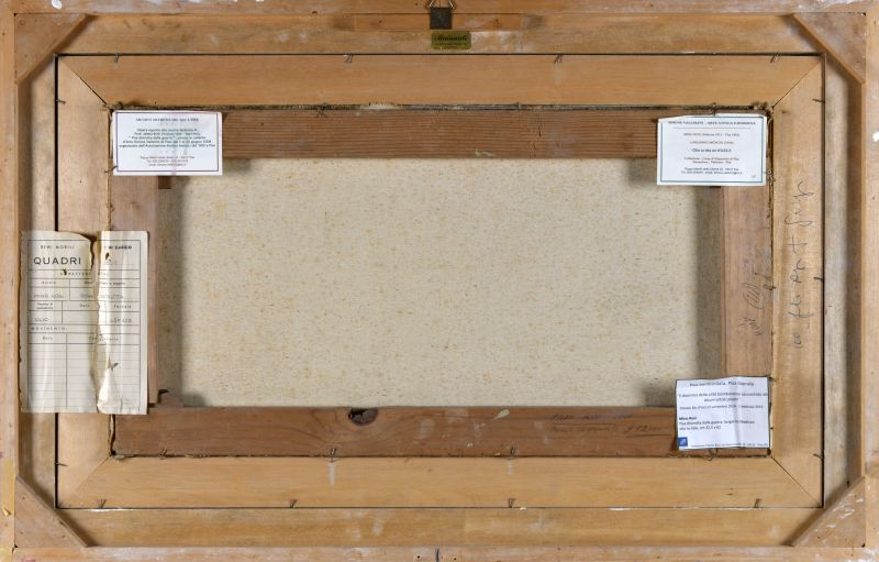 Dipinto a olio su tela con cornice in legno raffigurante uno scorcio del Lungarno Mediceo pisano distrutto dai bombardamenti della Seconda Guerra Mondiale del 31 agosto 1943