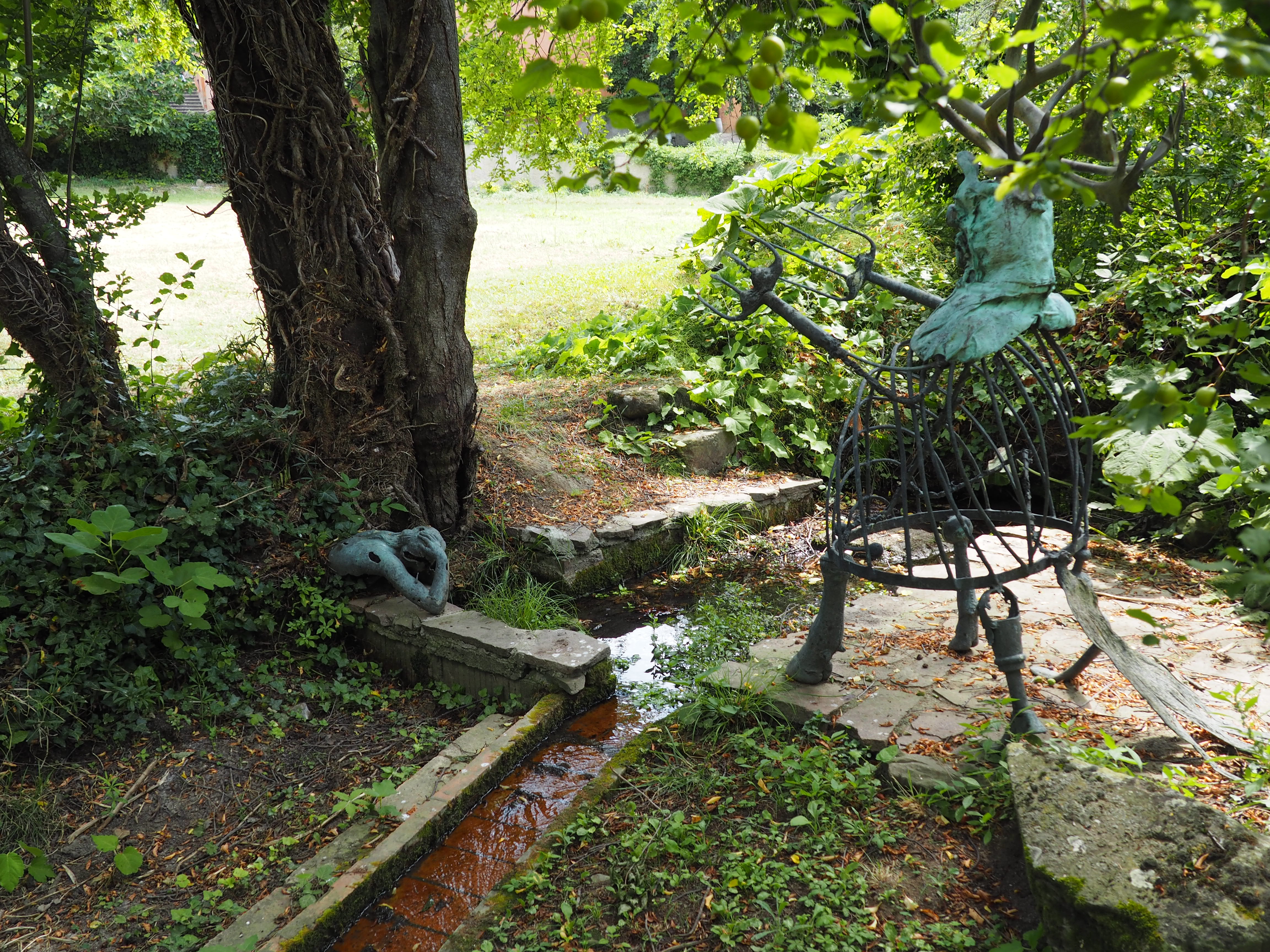 - ISCRIZIONI L'opera si compone di due sculture: la Bella si contempla nell'acqua ed è un busto femminile, una fusione di scarto di fonderia. Poco lontano la osserva la Bestia che ha come corpo una gabbia da fieno, due forconi per le braccia, una maschera peruviana e due corna di renna come testa. Gli opposti in un'opera -
