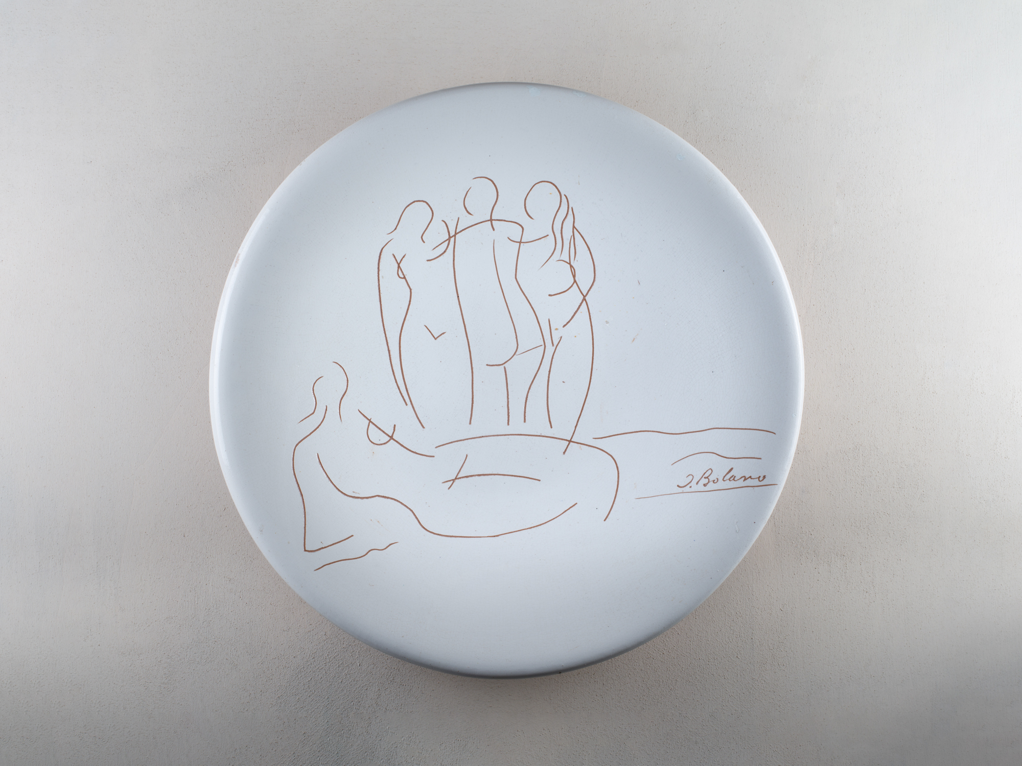 - NOTIZIE STORICO CRITICHE La ceramica raffigura in primo piano un nudo femminile semidisteso in riva al mare e sullo sfondo tre altre figure femminili racchiuse in un abbraccio. Autore dell'opera è Italo Bolano (1936-2020), artista elbano eclettico e poliedrico che nel corso della carriera si cimenta con le più diverse tecniche e materiali: disegno, acquerello, pittura su tela e su ceramica e scultura monumentale in acciaio e vetro Dallas. La sua pittura è passata dall'espressionismo figurativo all'espressionismo astratto, con ispirazione all'action painting americano. All'Elba realizza un Museo diffuso d'arte contemporanea, costituito da venticinque monumenti collocati nei vari comuni dell'isola, e l'Open Air Museum, museo a cielo aperto e crocevia di artisti internazionali. La ceramica si colloca all'interno di un filone tematico particolarmente caro a Bolano: la Donna Isola. In questa tematica, indagata nel corso di tutta la carriera con disegni, acquerelli e dipinti su tela e ceramica, l'artista racchiude l'amore profondo per la sua isola natìa, l'Isola d'Elba, e per la figura della donna, portando alla luce un'isola impersonificata, creatura immaginaria che è per lui "madre cosmica", generatrice di vita e insieme visione sensuale. Ne emergono delle composizioni caratterizzate da estrema sintesi e chiarezza del segno, animate da nudi femminili dalle forme morbide e sinuose tratteggiate da linee curve, fluide e guizzanti, che rimandano ai profili delle montagne e delle insenature dell'Elba. L'opera, donata dal Trust Arte Italo Bolano al Comune di Portoferraio, è esposta nello Spazio Bolano, un nuovo spazio espositivo all'interno delle Fortezze Medicee, nell'antica cannoniera buontalentiana restaurata e resa fruibile nel 2023 per accogliere e valorizzare le ceramiche del maestro elbano