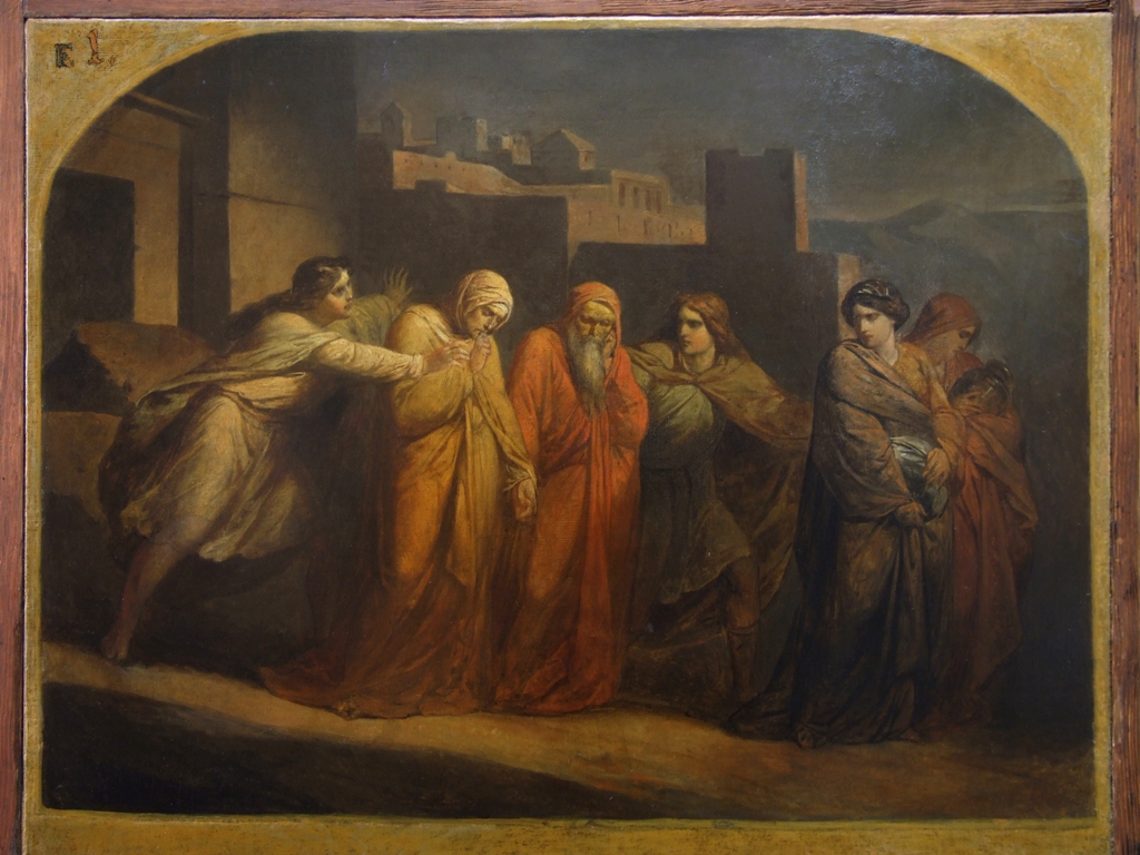 - NOTIZIE STORICO CRITICHE Il dipinto presenta una matrice classicista e poussiniana, consueta nella seconda metà del Seicento, tra i giovani artisti francesi che studiavano a Roma dopo aver vinto il Prix de Rome, la borsa di studio istituita dallo stato francese per gli studenti più meritevoli nel campo delle arti. Nel 1694 al concorso annuale all’Académie de France di Villa Medici a Roma fu dato proprio il tema “Loth et ses filles sortant de Sodome”, in cui risultò vincitore Noël Neveu, la cui opera è attualmente perduta, ma che potrebbe essere ricordata proprio da questo dipinto, che ne ripropone il soggetto ed anche lo stile austero. L’esecuzione del dipinto sembra risalire al tardo neoclassicismo e pertanto si può ipotizzare che sia una copia o una moderna interpretazione di un’opera più antica; anche la sigla presente in alto a sinistra, sul bordo dorato, non riferibile ad Aldi, farebbe pensare alle iniziali apposte dall’autore, su una prova presentata ad un concorso accademico, dove sempre era richiesto l’anonimato. Se il quadro faceva parte dell'eredità di Pietro Aldi, si può ipotizzare che il pittore lo abbia acquistato a Roma, perché ne apprezzava l’intonazione calma e severa che l’opera trasmette. (da IPCPA01-scheda 78). Secondo Bruno Santi (cfr. PAB00002) il dipinto è invece opera di Pietro Aldi che organizza efficacemente l'episodio biblico su due registri: in primo piano il gruppo di fuggitivi aiutati dai due angeli e sullo sfondo le mura e le torri della città corrotta di Sodoma illuminate dal bagliore dell'incendio divino