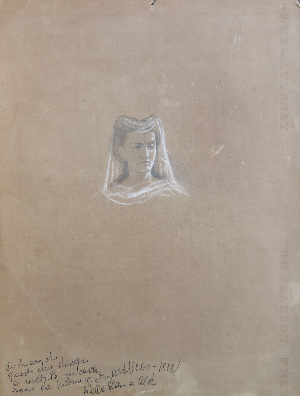 - ISCRIZIONI verso, in basso a sinistra - Dichiaro che/ questi due disegni/ a matita su carta/ sono del pittore Pietro Aldi (1852-1888)/ Nella Maria Aldi - Aldi, Nella Maria - corsivo -