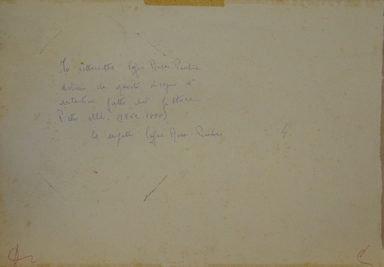 - NOTIZIE STORICO CRITICHE La signora sembra la stessa ritratta da Pietro Aldi sulla tavolozza (Inv. n. 057/P), dipinta su tela con il cappello (Inv. n. 052/P) e scelta come modella per uno degli angeli (Inv. n. 007/P) raffigurati nella Cappella Pollini del cimitero della Misericordia di Siena. Ignoriamo l’identità della fanciulla, ma la dedica scritta su questo disegno fa pensare che tra lei ed il pittore esistesse un legame sentimentale: nella parte destra del foglio sono presenti quattro tagli in diagonale, per l’inserimento di una fotografia che probabilmente ritraeva lo stesso Aldi