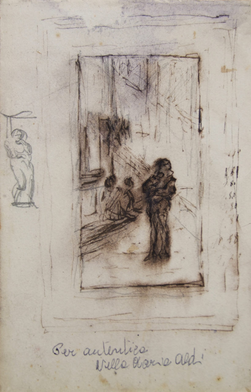 Foglio con disegni eseguiti su entrambe le facce in modo rapido. Sul recto a matita nera è delineata una figura in piedi in un interno, con a sinistra una sedia e a destra un letto a baldacchino sul quale è distesa una seconda figura. Sul verso entro una cornice rettangolare è delineata ad inchiostro di china una figura in piedi di fronte alla quale sono due figure sedute su un ripiano e sopra le loro teste sembrano essere delle finestre di abitazioni. All'esterno della cornice è delineata velocemente a matita una figura femminile in piedi, veduta di tre quarti con la gamba destra leggermente piegata e la testa chinata verso il basso sorretta dalla mano del braccio sinistro piegato