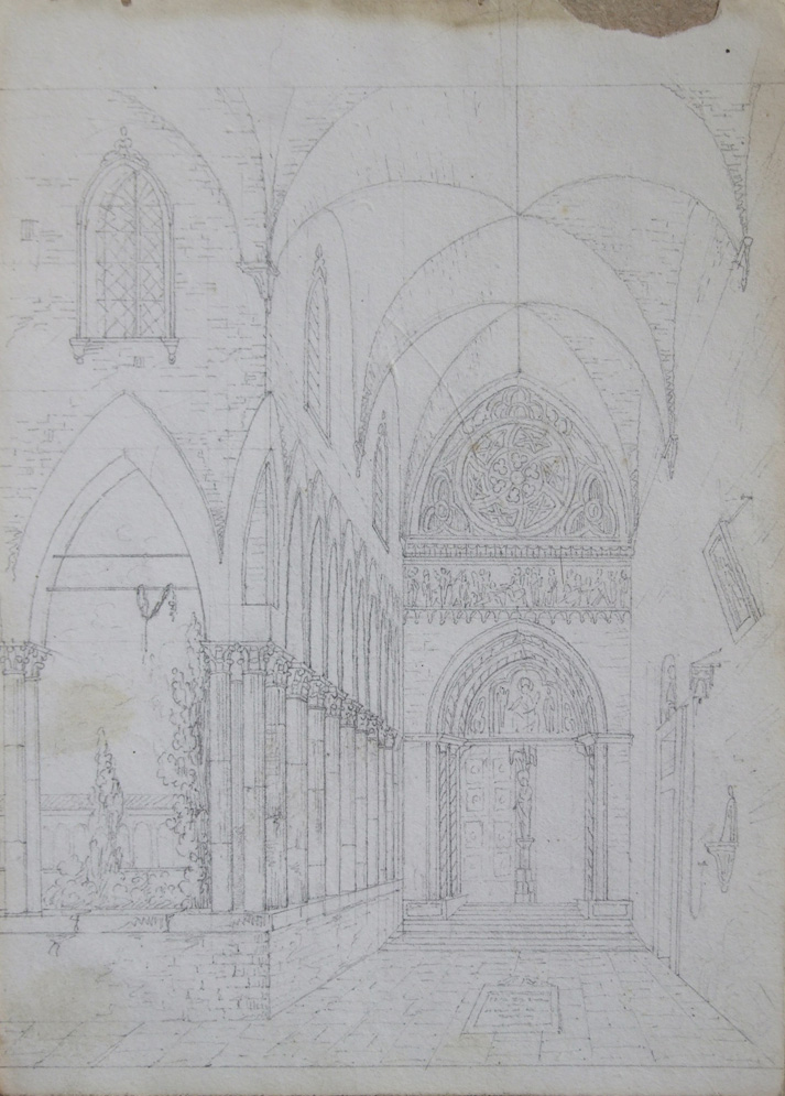 Disegno eseguito a matita nera su carta bianca raffigurante il corridoio di un chiostro con in fondo un portale con lunetta archiacuta scolpita, sovrastato da altri rilievi e forse da una vetrata circolare e sul lato sinistro un muretto basso con colonne binate che sostengono archi a sesto acuto e che delimitano l'area scoperta