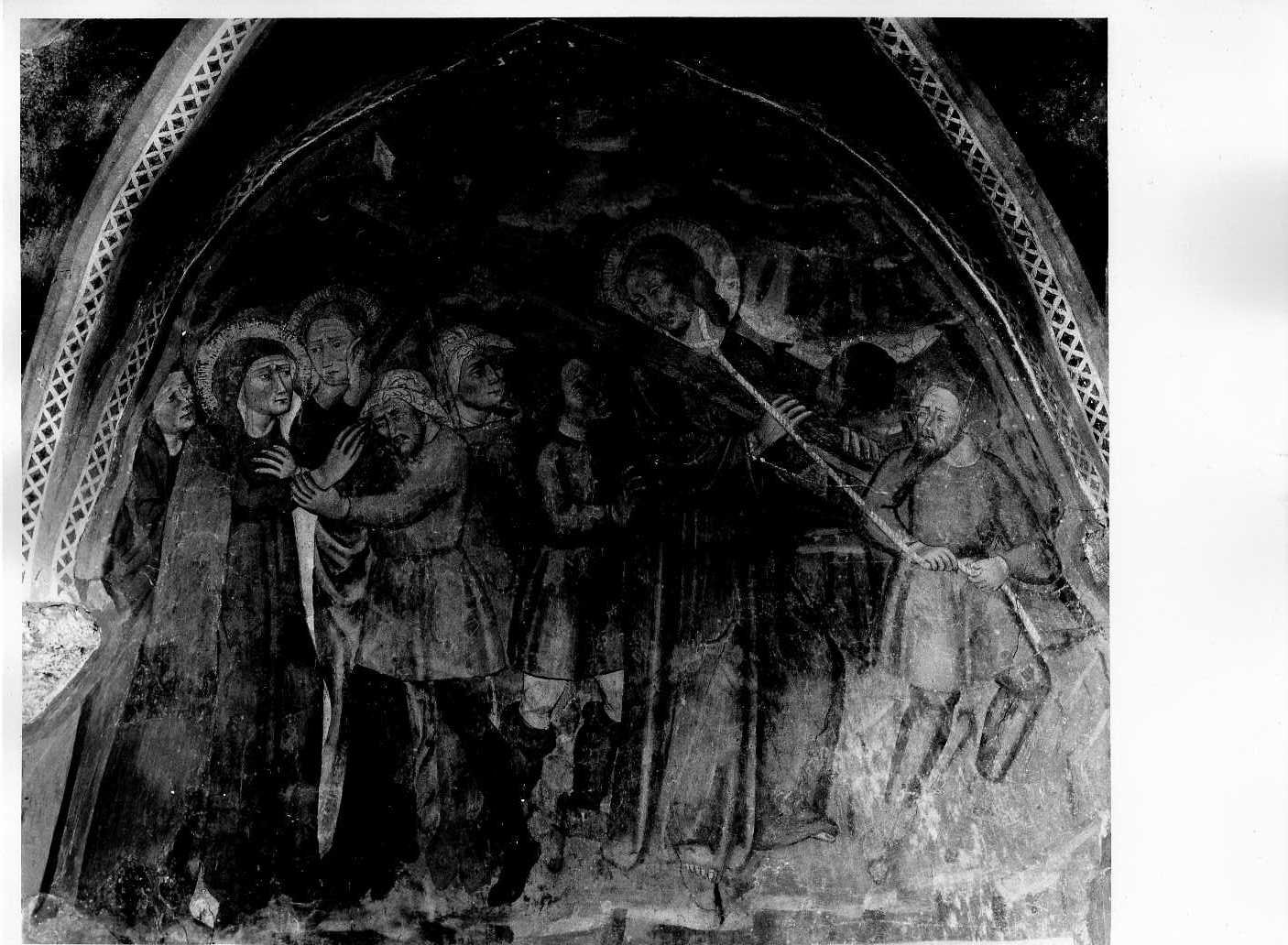 - NOTIZIE STORICO CRITICHE Il dipinto fa parte di un ciclo pittorico, attribuito da F. Zeri al Maestr o di Eggi. E' questi un piccolo maestro variamente attivo nella Valle Spol etana e nel Nursino, caratterizzato da una commistione di elementi attinti dalla produzione spoletina del trecento, nel seguito del Maestro di Fossa , ravvivati da irrealistiche cadenze desunte dall'opera di Bartolomeo di T ommaso. Più che di un singolo artista si potrebbe parlare di una corrente culturale, che con minime varianti investì l'intera Umbria meridionale, co n risultati a volte piacevoli anche se basati su formule standard legate a lla tradizione pietistica popolare. Allo stesso maestro spettano alcuni af freschi nella testata della navata destra della chiesa