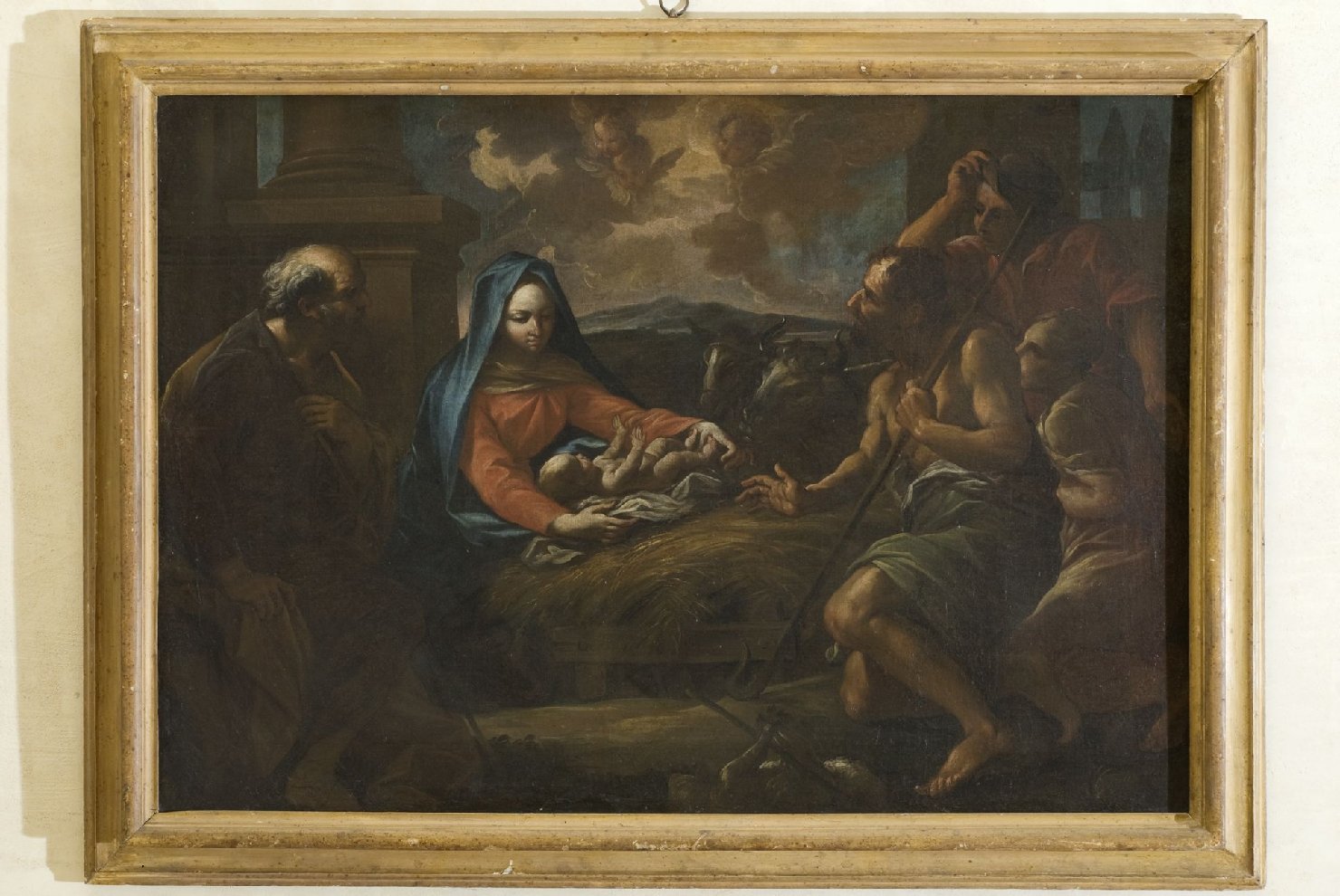 Maria, al centro del dipinto, tiene in braccio Gesù. Intorno, a sinistra, tre pastori con strumenti di lavoro; a destra di Maria, San Giuseppe. Accanto al Bambino l'asino e il bue dei quali si vedono solo le teste. A sinistra del quadro base e parte di una colonna. Sullo sfondo, paesaggio con, in alto, tre teste di angioletti alati fra le nuvole