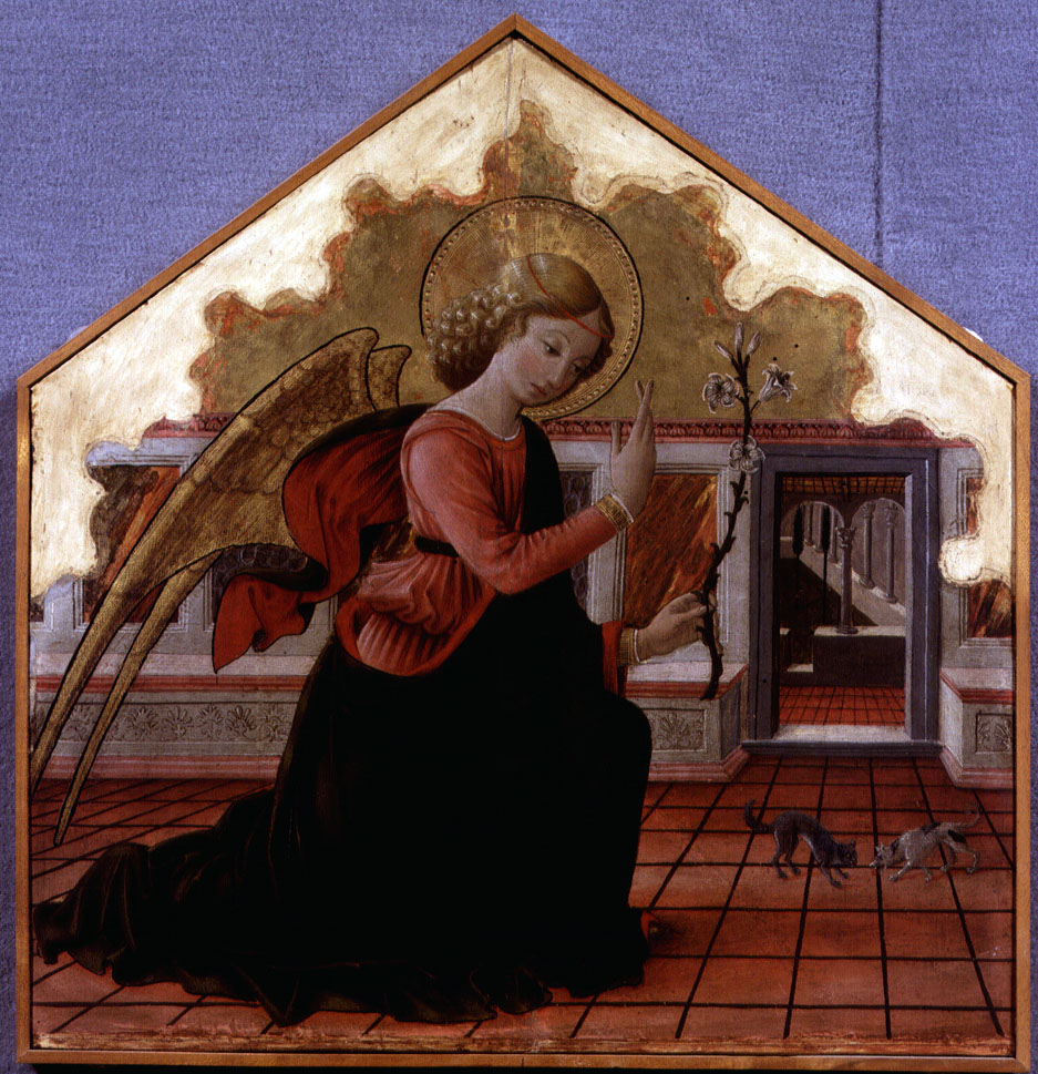 - NOTIZIE STORICO CRITICHE Tradizionalmente ritenuta parte del polittico dipinto nel 1467-1468 da Benedetto Bonfigli e Bartolomeo Caporali per la cappella di San Vincenzo Ferrer, fondata dal mercante perugino Francesco di Pietro Gambella, la tavola è sempre stata posta in relazione con l'altra (inv. 143) raffigurante la Vergine Annunziata, quattro Santi (inv.142, 145), la Madonna col Bambino e Angeli musicanti (inv.144), tutte provenienti da San Domenico e conservate in Galleria a seguito delle demaniazioni postunitarie (Santi, 1985, pp.5 1-52 con bibliografia precedente). Recentemente Mancini (1992, pp.73, 120- 127) ha proposto di smembrare questo gruppo e di riconoscerre nei quattro Santi parte di una tavola che era nella cappella di San Pietro Martire, patronato della famiglia Guidoni, mentre la Madonna col Bambino e l'Annuncia zione - attribuita a Bartolomeo Caporali - costituirebbero l'unica testimonianza superstite della pala dipinta in collaborazione dai due maestri perugini per l'altare di San Vincenzo Ferrer. Questa ipotesi è stata solo parzialmente accolta da Lunghi (1996, pp.130-132) che individua nella Madonna con Bambino un'opera giovanile di Bonfigli, svincolandola quindi dai documenti del 1467-1468, nei quattro Santi - e in due tavolette di predella con Miracoli di San Vincenzo Ferrer in collezione privata pubblicati da Todini (1989, I, p.42-44; Mancini, 1992, pp.126-127 entrambi con l'errata identificazione dei soggetti) - ciò che rimane del polittico eseguito in collaborazione da Bonfigli e Caporali, nell'Annunciazione, ascritta al Caporali, parte di un'opera non meglio identificata, poiché la sua morfologia non consente di ancorarla a nessuna delle altre tavole già riunite sotto il nome di polittico di San Vincenzo. Lunghi ritiene, infatti, che allo stato attuale non è assolutamente possibile precisare l'ubicazione originaria delle due tavolette, da collocarsi cronologicamente sullo scadere degli anni Sessanta del Quattrocento, in un momento compreso tra il gonfalone dei Legisti dell'Alunno (1466), citato nella pignatta di fiori alle spalle della Vergine, e il 1472, anno in cui Giapeco Caporali, fratello di Bartolomeo, esegue la decorazione del frontespizio del corale M dell'Archivio di San Pietro dove è impiegata una partitura architettonica analoga a quella che fa da sfondo all'Angelo annunziante, particolare per il quale viene suggerito il nome dello stesso Giapeco