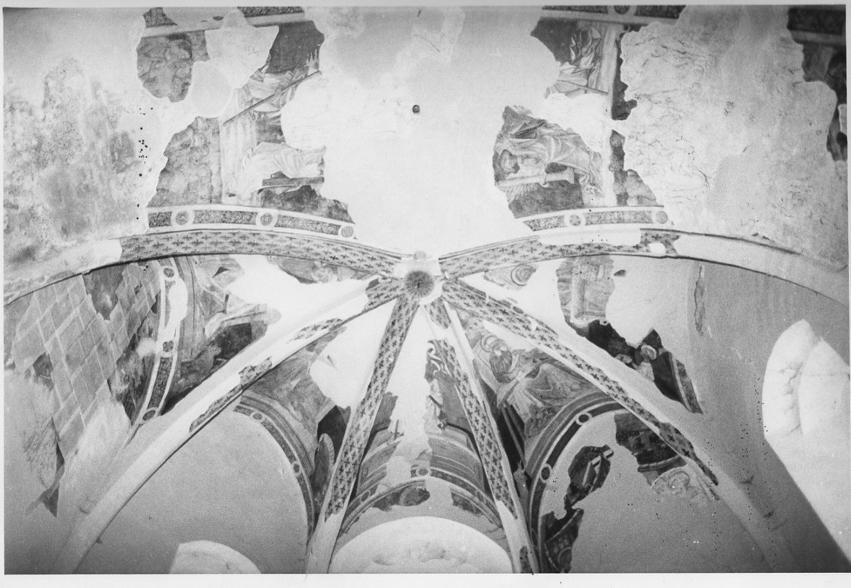 Volta dell'abside e arcone. Nella volta dell'abside, a costoloni che scandiscono 5 vele, sono rappresentate cinque figure ridotte inframmenti, delle quali, quattro gli Evangelisti, in atto di scrivere, ed al centro il Cristo sorgente dall'avello. Nella priam parete della volta, da sinistra, è raffigurato l'episodio delle stimmate di S. Francesco; nella quarta, è visibile una tenda, probabilmente rappresentante al suo interno la scena della Maestà, di cui rimangono ai lati frammenti di Santi; all'esterno, entro una fascia ornata riccamente sono degli stemmi araldici. Nell'arcone si scorgono frammenti dei Dannati e degli Eletti