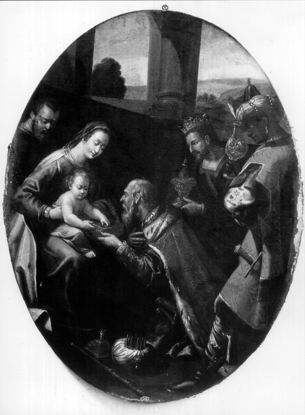 Al centro della tela uno dei Magi inginocchiato, con manto rifinito in oro ed in ermellino ed una veste di raso, offre un cofanetto al Bambino. Ai suoi piedi il coperchio di tale cofanetto, uno scettro ed un copricapo con corona e ciondolo. Anche le vesti degli altri Magi sono ricamate e quella in primo piano a destra ha il tono più vivace. Fa da sfondo un paesaggio