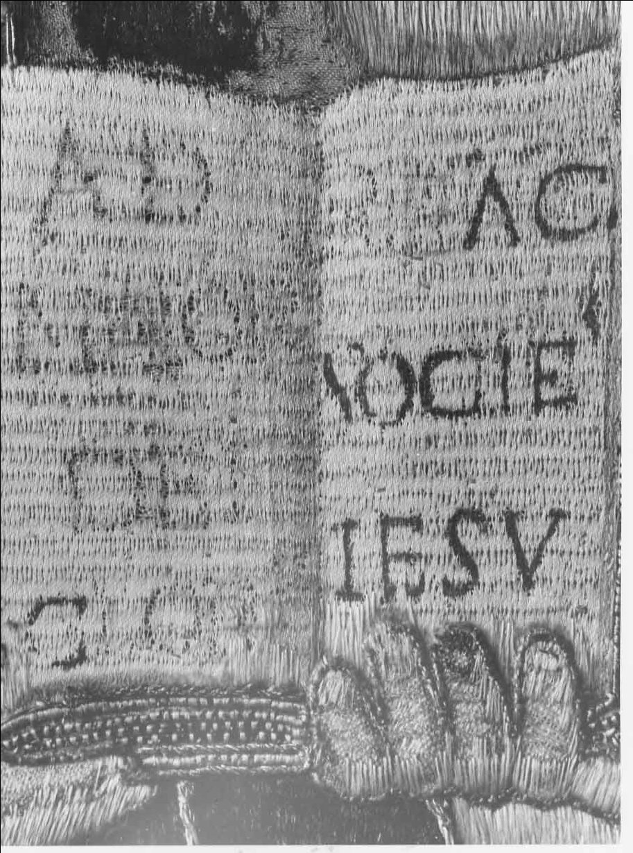 Modello canonico romano. Teletta d'argento prodotta da una trama e un ordi to entrambi di fondo legati in taffetas e da un ordito supplementare che l ega in taffetas le trame supplementari di argento. Ricamo in argento dorat o, con tecnica di applicazione con o senza imbottitura, a punto stuoia, po sato, pieno. L'oggetto è delimitato da una trina a fuselli di argento dora to. In posizione speculare, con andamento verticale si sviluppa un motivo ed esili racemi arricchiti da foglie e fiori stilizzati e racemi mistiline i. La colonna centrale è definita in verticale da una coppia di tralci spe culari con foglie d'acanto e fiori. I colori sono fondo, avorio; ricamo in argento e oro. Trina gialla e oro. Fodera color avorio