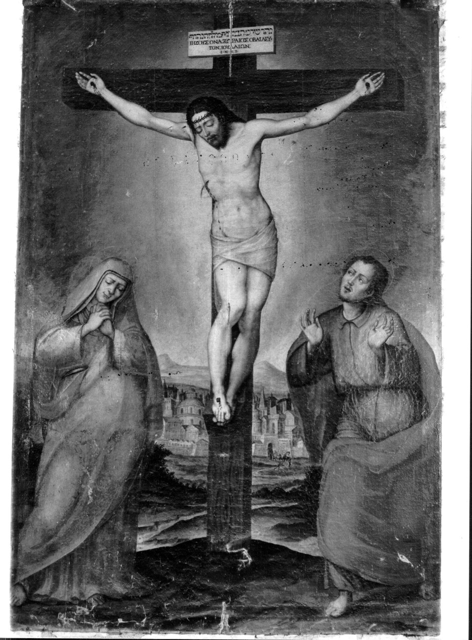 Soggetti sacri: Nuovo Testamento: Cristo crocifisso. Personaggi: Gesù Cristo; Madonna; San Giovanni evangelista. Strumenti del martirio: Croce. Architetture: Città. Abbigliamento