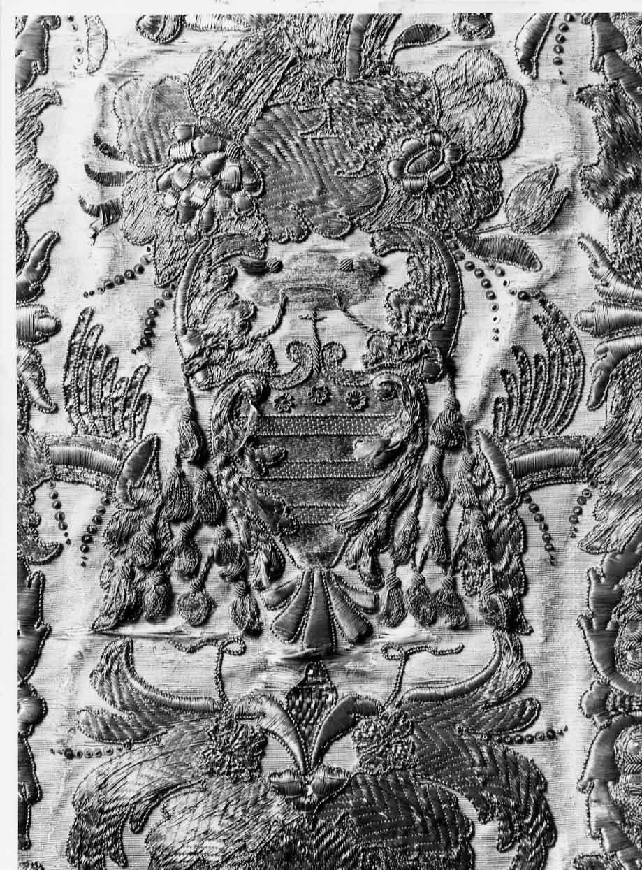 - NOTIZIE STORICO CRITICHE Sul retro della pianeta, eseguito in fastoso ricamo, stemma cardinalizio d i F.A Gualterio (1701-1728); cornice con tre bande orizzontali che suddivi dono in quattro spazi il fondo celeste, nel superiore tre rosellineo ghian de. Il ricamo risente ancora del gusto barocco e include motivi Berain (co rnici con motivi a pizzi)