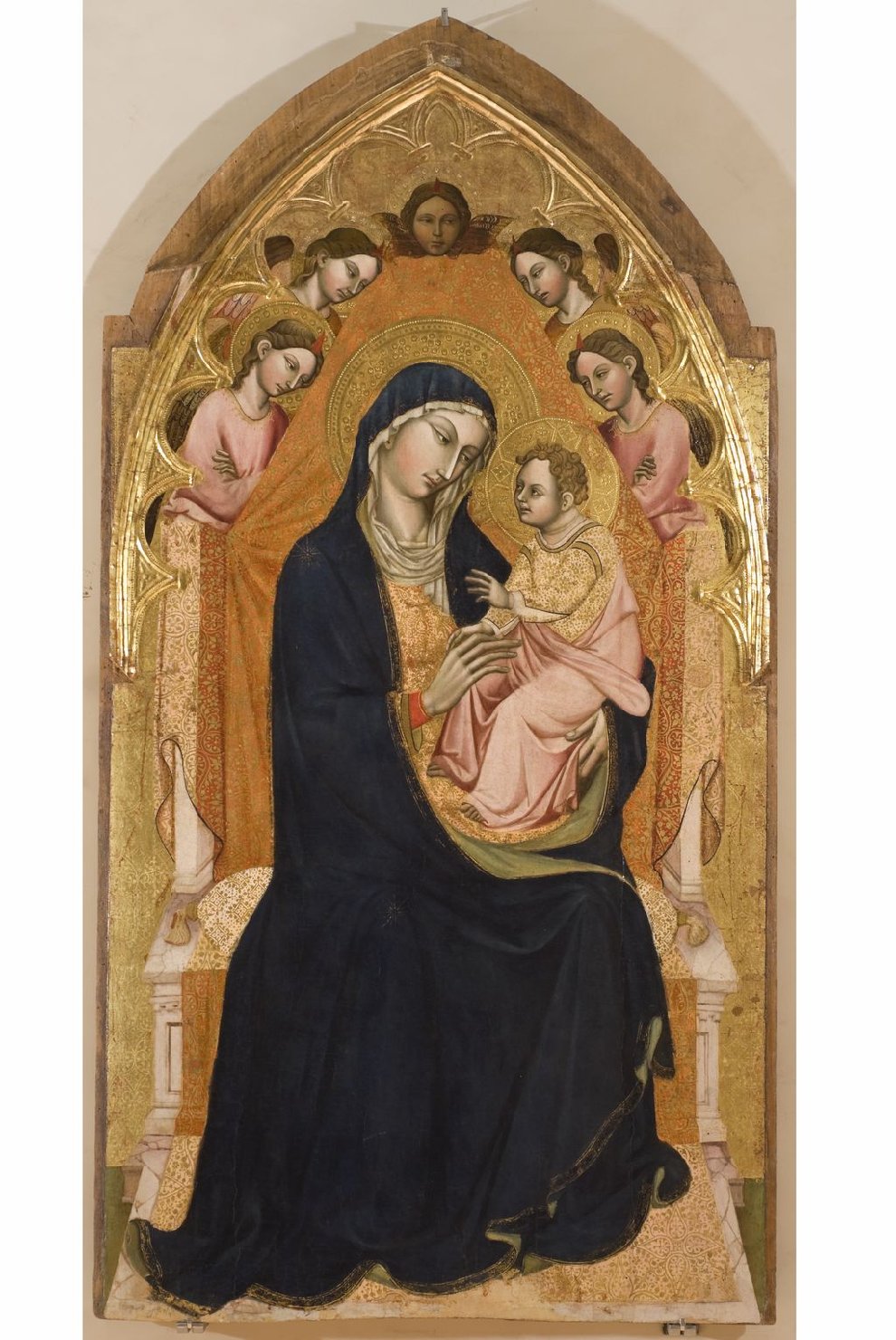 - NOTIZIE STORICO CRITICHE Non si conosce l’originaria collocazione della tavola, che pervenne in Galleria nel 1995 a seguito dell’acquisto da parte del Ministero dalla casa d’aste Finarte di Milano (Garibaldi, 1996, pp.127-129). Già attribuito a Simone Martini, il dipinto nel 1909 passò dalla collezione Ferroni a quella Tavazzi, per essere venduto presso la Galleria Sangiorgi (14-22 aprile 1909, n. 273). Nel 1982 riapparve ad un’asta Sotheby’s (17 novembre 1982, n. 28) e nel 1995 venne presentato dalla casa d’aste Finarte di Milano (8 giugno 1995, n. 98) per poi essere acquistato dal Ministero per i Beni Culturali. Parte di un perduto polittico, la tavola si caratterizza per l’attenzione rivolta alla pittura senese e tardogiottesca, tratto tipico della produzione artistica dell’Umbria meridionale alla fine del Trecento. Il Maestro della Dormitio di Terni, a cui è attribuita l’opera, prende il nome da un affresco con la Dormitio Virginis nella chiesa di san Pietro a Terni. Tra gli ultimi due decenni del XIV secolo e i primi anni del Quattrocento, divenne uno dei protagonisti indiscussi del linguaggio affermatosi nel Ducato di Spoleto dove elementi tratti dalla tradizione locale (Ugolino di Prete Ilario, Cola Petruccioli, Giovanni di Corraduccio) e dai grandi esempi martiniani e giotteschi, vennero rielaborati alla luce del più moderno stile tardogotico (cfr. Garibaldi, 2015, pp. 283-285 con bibliografia precedente e la scheda di V. Picchiarelli in Arti del Medioevo, 2021); quest'ultimo contributo fa il punto sulla storia attributiva, a partire da Zeri (1963) che fu il primo ad accorpare attorno alla figura del Maestro un nutrito di opere caratterizzate da un linguaggio multiforme, allargandolo ad "apporti molteplici, che vanno dalla pittura di area adriatica a quella senese" visti però attraverso l'interpretazione dei pittori della "grande stagione orvietana (Picchiarelli, 2021, p. 136). Sono state proposte diverse possibili identificazioni dell'anonimo pittore: Francesco di Antonio da Ancona o Domenico da Miranda. L'area molto ampia di azione dell'artista coincide con l'ampio arco cronologico di attività che viene definito a partire dal 1369 (se si riconosce nel Maestro il nome di Domenico da Miranda, documentato in quell'anno presso il papa Urbano V) sino ai primi anni del XV secolo, periodo in cui ricadrebbe la tavola della Galleria vicina per le "figure esili, i profili affilati, le minute decorazioni" a un affresco pressoché sconosciuto del coro della chiesa di Santa Caterina delle Vergini a Foligno raffigurante Santa Caterina d'Alessandria, considerata tra le ultime opere del Maestro (Picchiarelli, 2018, pp. 62-67 e 2021, p. 136)