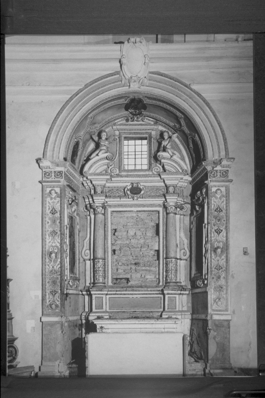due colonne laterali con girali vegetali nella parte inferiore e scanellatura nella parte superiore; al centro nicchia rettangolare vuota con cornice a foglie dorata; architrave con cartiglio al centro ed iscrizione, elementi vegetali; cimasa con timpano spezzato con volute e due figure angeliche ai lati; cornice esterna con testine angeliche, motivi vegetali, grottesche; intradosso dell'arco e parti laterali con riquadrature sagomate con immagini dipinte