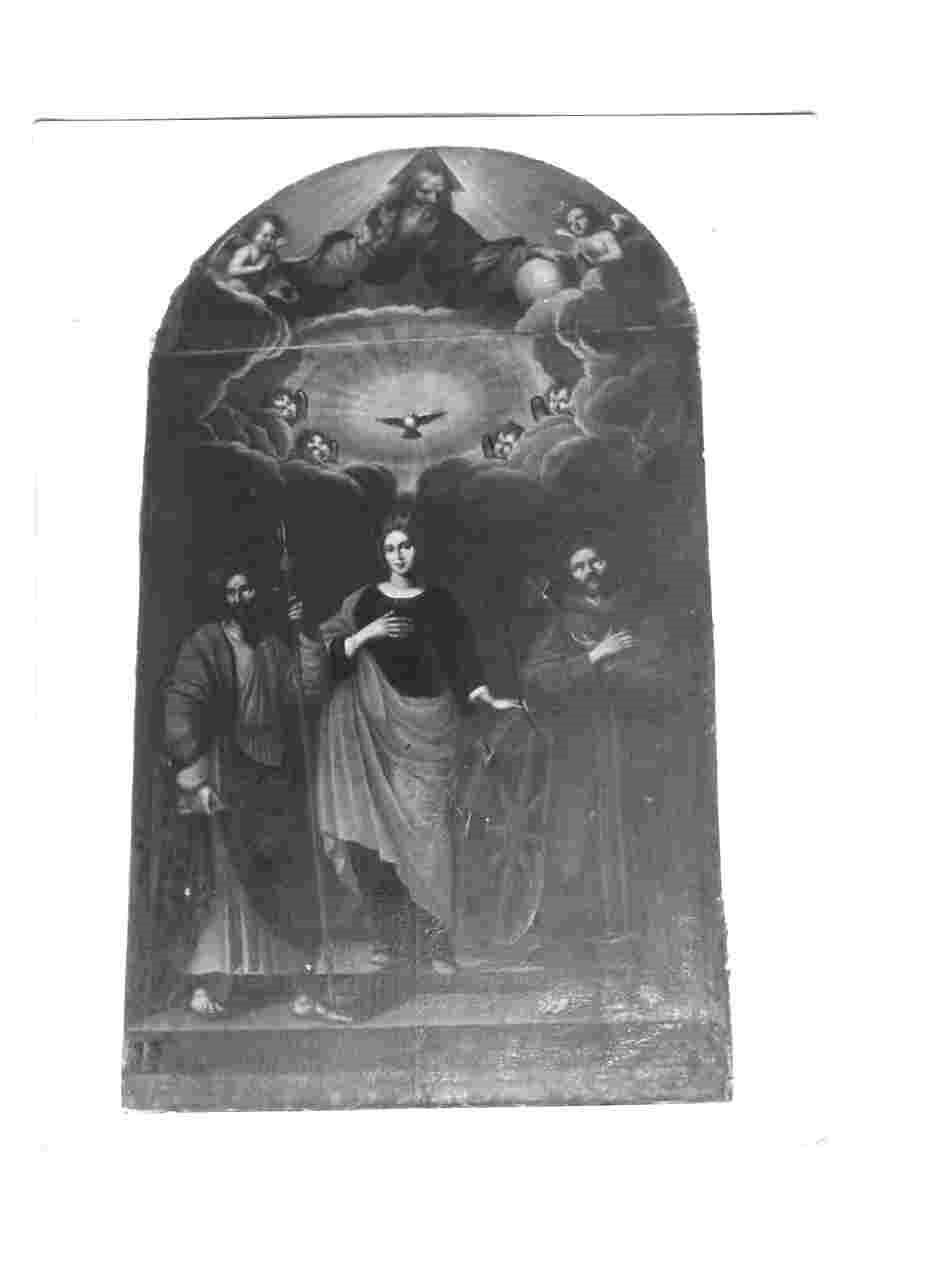 Personaggi: Madonna; San Francesco; San Giacomo Apostolo; Santa Caterina D 'Alessandria; Padre Eterno; Angeli; Colomba