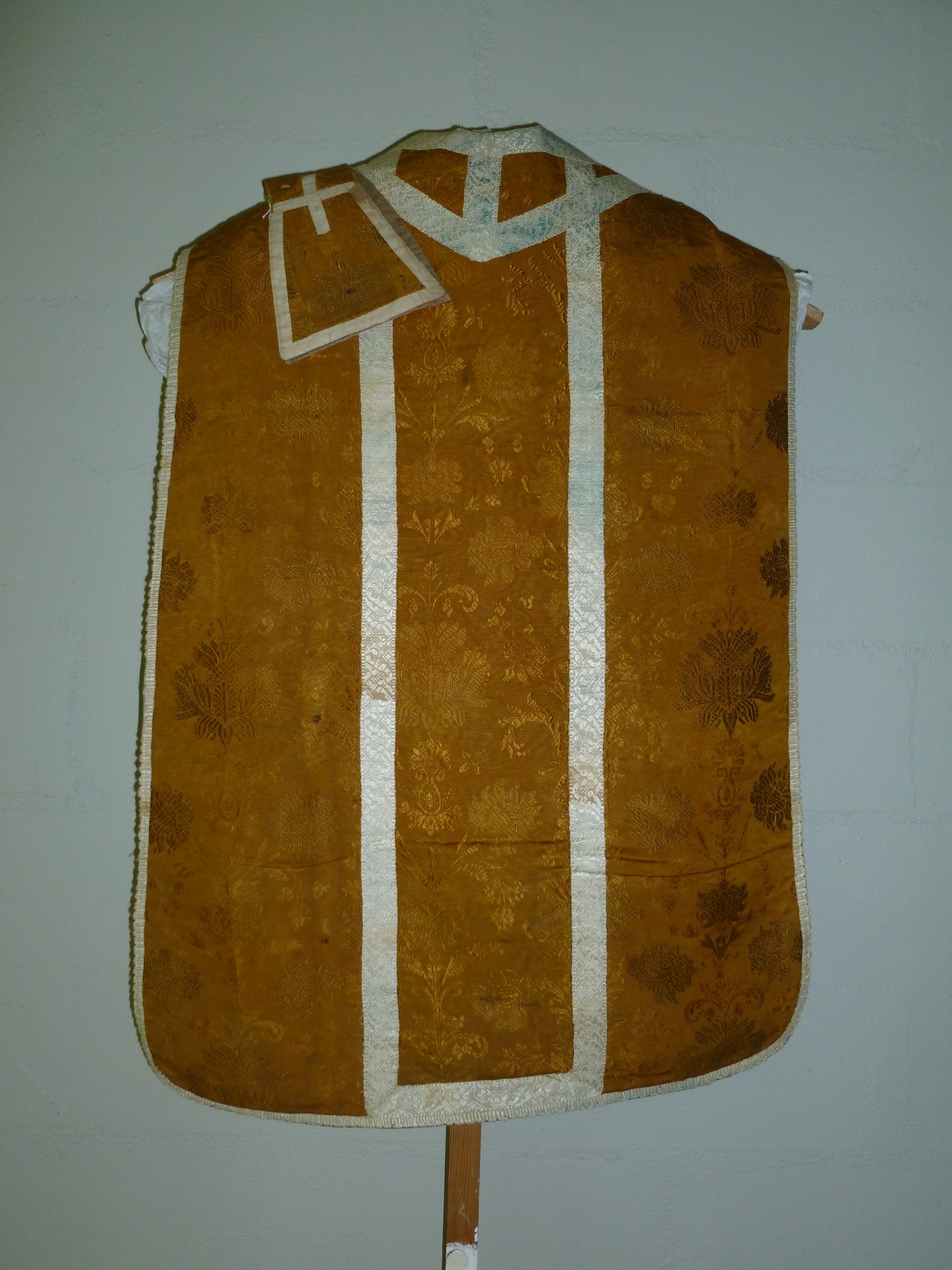 Paramento liturgico composto da pianeta e manipolo in seta giallo ocra. Fondo gros de Tours, disegno per effetto di una trama liseré. Due composizioni floreali costituite da un grande fiore centrale innalzato su uno rigido stelo, accompagnato nella prima soluzione da fiori tipo peonie e nella seconda da una coppia di narcisi, si dispongono in serie verticali sfalsate con impostazione a candelabra. Galloni a telaio in seta bianca