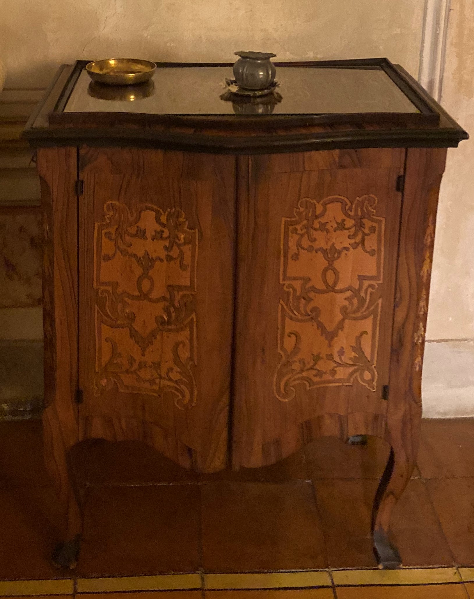 - NOTIZIE STORICO CRITICHE Comodino in legno impiallacciato in radica di noce, dipinto a finto intarsio