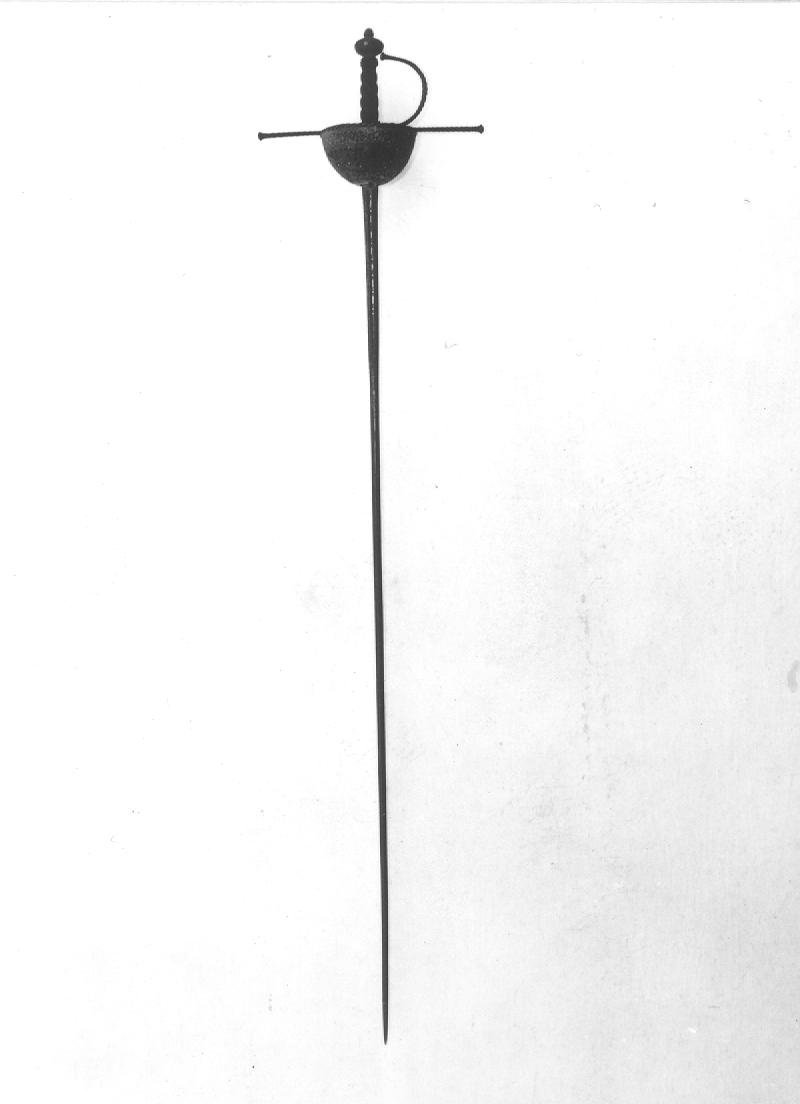 - NOTIZIE STORICO CRITICHE Questo tipo di spada è detto anche "alla spagnola", con riferimento alla sua tipologia iniziale. Dalle prime due ampie calotte se nè sviluppò una più completa con ponticelli fra le calotte; da queste, poi, si passò a quelle con quattro lobi per terminare con il presente esemplare, con tazza dal margine superiore a cerchio. Queste spade, nel duello erano adoperate con una daghetta che aveva a protezione della mano una vela triangolare