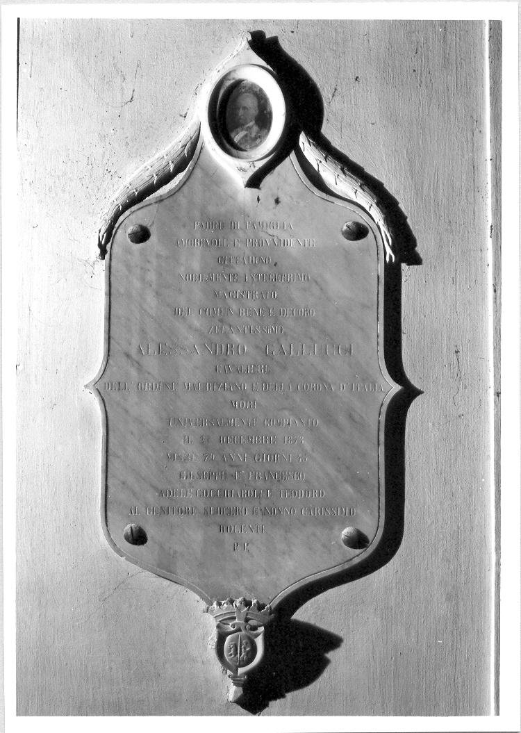 - ISCRIZIONI PADRE DI FAMIGLIA/ AMOREVOLE E PREVIDENTE/ CITTADINO/ NOBILMENTE INTEGERRIMO/ MAGISTRATO/ NEL COMUN BENE E DECORO/ ZELANTISSIMO/ ALESSANDRO GALLUCCI/ CAVALIERE/ DELL'ORDINE MAURIZIANO E DELLA CORONA D'ITALIA/ MORI' UNIVERSALMENTE COMPIANTO/ IL 21 DICEMBRE 1873/ VISSE 79 ANNI GIORNI 45/ GIUSEPPE E FRANCESCO/ ADELE COCCHIARON E TEODORO/ IL GENITORE SUOCERO E NONNO CARISSIMO/ DOLENTI/ PP - lettere capitali -