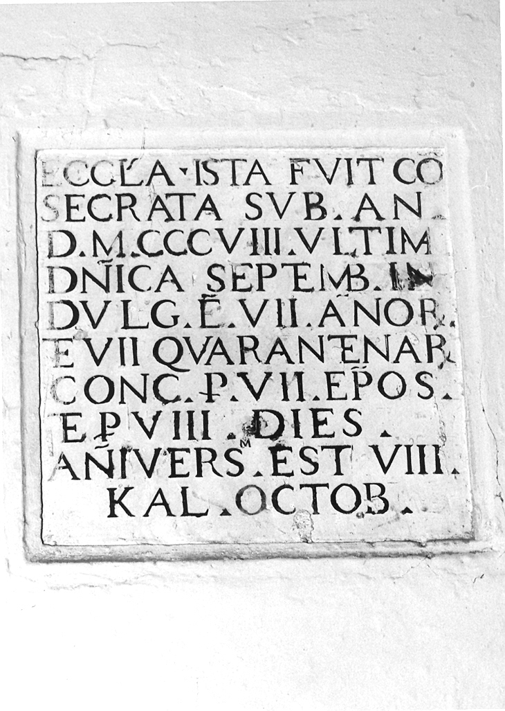 Lapide dedicatoria alla Consacrazione della chiesa in caratteri romani ripassati in nero su fondo bianco