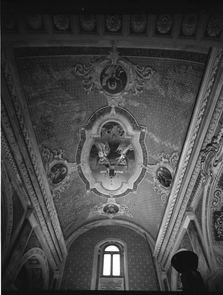 Chiesa: al centro della volta, entro una cornice sagomata: Sant'Andrea Avellino adora il SS. Sacramento e anime purganti. Ai quattro lati: quattro ovali raffiguranti, a partire dall'ingresso: busto di santa, Madonna con Bambino e San Giovannino, Madonna con la Croce e calice eucaristico, Cristo Redentore. Arco del presbiterio: Santa Tecla (?) tra angeli. Cappella destra: soffitto ornato da otto specchiature con motivi decorativi a girali e vasi che si raccordano sul tondo centrale, dove sono dipinti Croce, Agnus Dei e palma del martirio