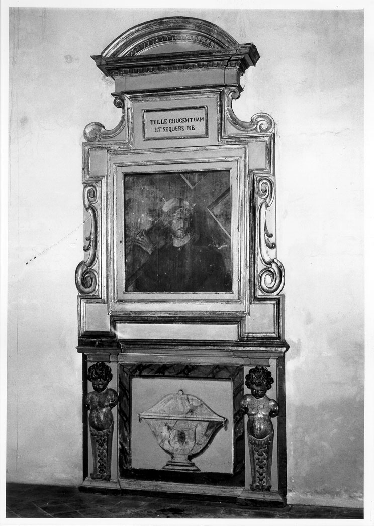 - NOTIZIE STORICO CRITICHE La teca è posta a protezione dell`affresco raffigurante "Cristo portacroce". Lo schema compositivo e la scelta dei motivi decorativi suggeriscono una datazione tra la fine del Seicento e l'inizio del Settecento. Particolarmente pregevole risulta la resa anatomica dei due putti cariatide