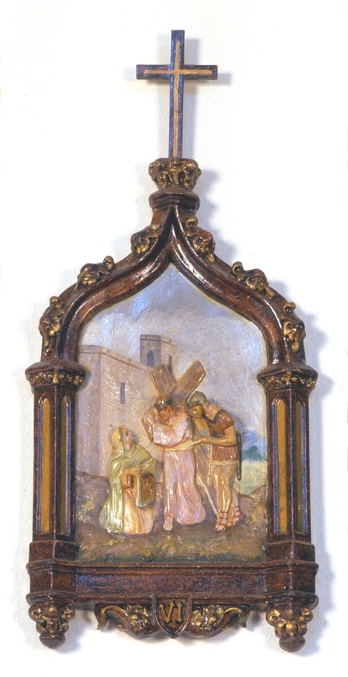 Personaggi: Cristo; Santa Veronica. Figure: Soldato. Architetture. Oggetti: croce