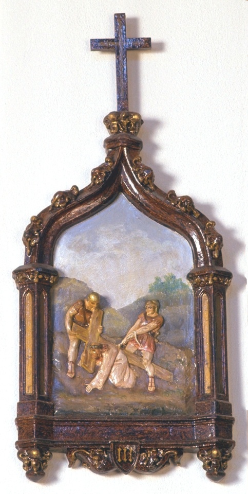 Personaggi: Cristo. Figure: soldati; carnefici. Paesaggi. Piante. Oggetti: croce