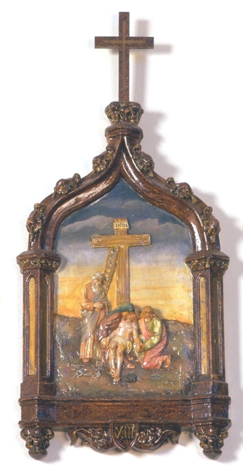Personaggi: Cristo; Madonna; San Giovanni Evangelista; San Giuseppe. Oggetti: scala; croce. Paesaggi