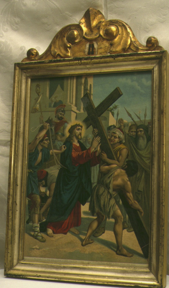 Cornice modanata con cimasa su cui sono segnati i numeri delle stazioni di Via Crucis