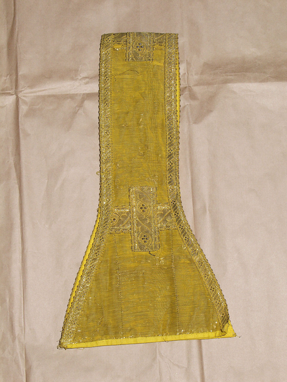 Paramento si seta gialla uniforme laminata in oro, con galloni lungo il perimetro e a formare le tre croci. Il rivestimento è in lino giallo
