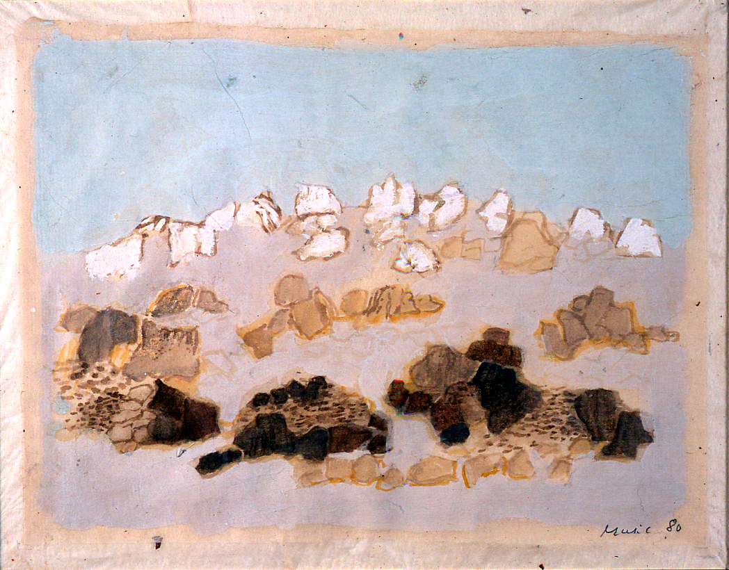 - NOTIZIE STORICO CRITICHE L'opera appartiene agli anni veneziani della produzione di Music e stilisticamente è avvicinabile al ciclo Paesaggi rocciosi (1976), si ripetono i segni di impronta informale, le macchie e gli interventi cromatici zonali giustapposti al fondo chiaro, quasi trasparente, sul quale il figurativo sembra dissolversi