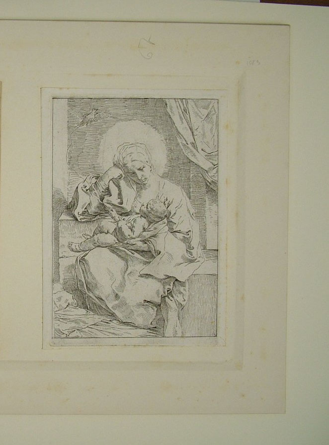 • NOTIZIE STORICO CRITICHE Il rame di questa incisione è conservato presso la Calcografia Nazionale (inv. 305), dalla lastra, tra il 1937 ed il 1971 sono stati tirati settanta esemplari. La stampa è stata datata più o meno agli anni in cui risale il soggiorno bolognese del Cantarini, per la stretta vicinanza allo stile di Guido Reni. Tuttavia, se reniano è il panneggio mosso e ricco della Vergine, la sua struggente malinconia ha un sapore diverso rispetto all'assorto languore dei modelli di Guido. La Vergine è moderna e si accosta alle novità del linguaggio figurativo romano