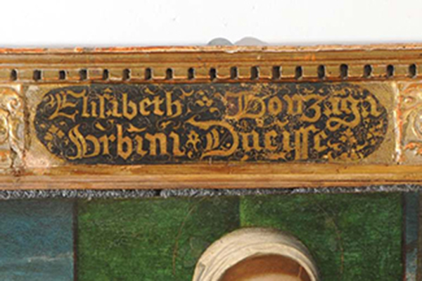 - ISCRIZIONI nel cartiglio in alto - ELISABETH GONZAGA/ URBINI DUCISSE - caratteri gotici - a pennello - latino