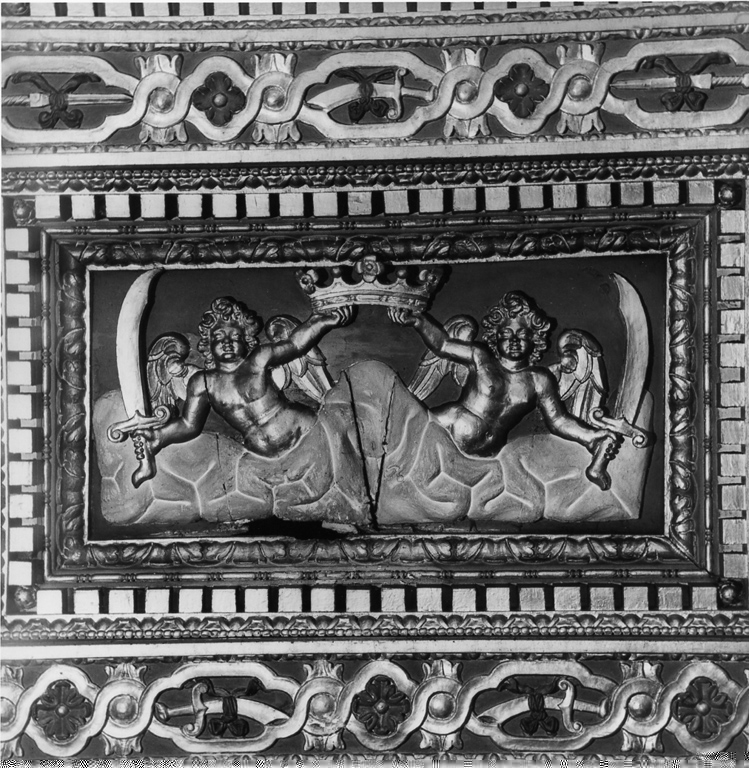 - NOTIZIE STORICO CRITICHE Il soffitto è stato intagliato da Andrea Masini nel 1628 e dorato da Ludovico Gonnetti nel 1653. Si ha notizia che nel vano centrale, ove attualmente è dipinto lo stemma della Confraternita della morte vi era una tela di V. Manenti datata 1657 raffigurante San Pietro Martire in gloria andata distrutta nel 1913