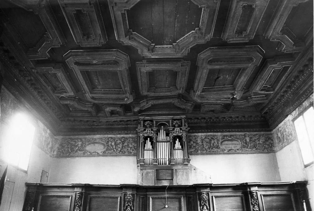 soffitto suddiviso in lacunari poligonali con spesse cornici modanate profilate in oro; sopra l'altar maggiore, entro un lacunare, ornato di racemi e volute, è uno stemma