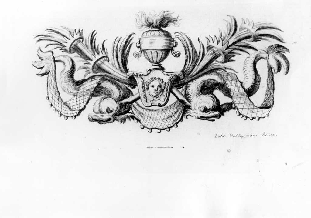 Decorazioni: tralci di acanto; delfini; vaso; mascherone