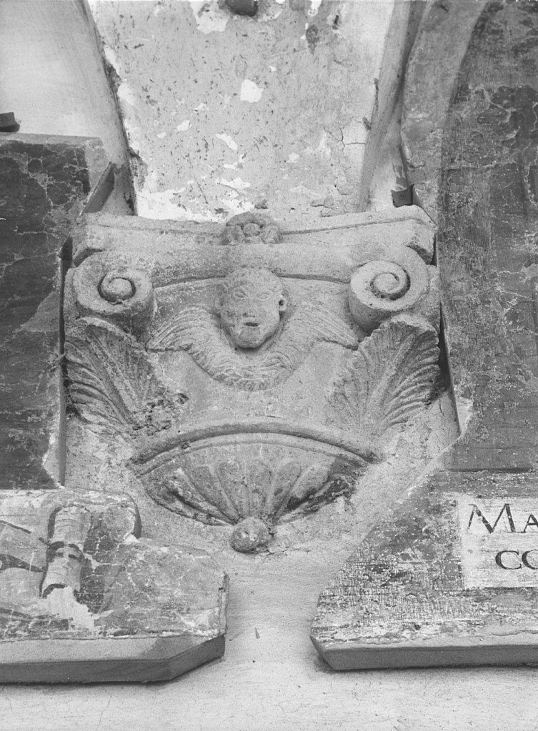 A campana rovesciata con cornice sagomata e rosetta centrale nella parte superiore; nella parte mediana due volute laterali e due foglie, e al centro una testa di putto alato