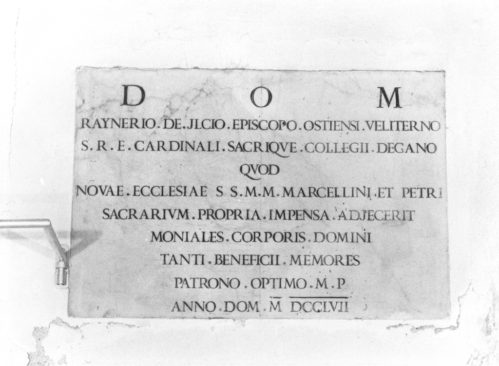 - ISCRIZIONI al centro - DOM/ RAYNERIO DE JLCIO EPISCOPO OSTIENSI VELITERNO/ S.R.E. CARDINALI SACRIQVE COLLEGII DECANO/ QVOD/ NOVAE ECCLESIAE SS.M.M. MARCELLINI ET PETRI/ SACRARIVM PROPRIA IMPENSA ADJECERIT/ MONIALES CORPORIS DOMINI/ TANTI BENEFICII MEMORES/ PATRONO OPTIMO M.P./ ANNO DOM M DCCLVII - lettere capitali - a solchi -