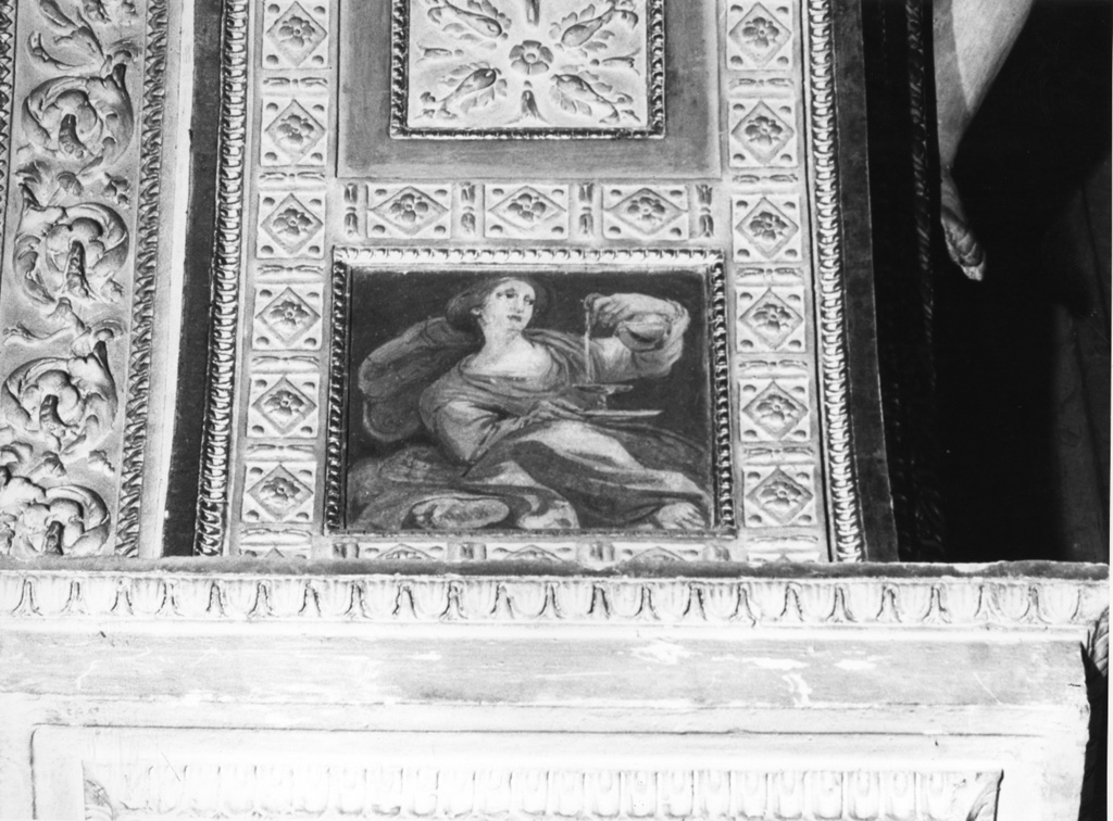 Allegorie-simboli: figura femminile simbolo della Temperanza. Attributi: (Temperanza) alzata; bottiglia con acqua