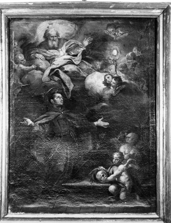 Personaggi: San Pasquale Baylon; Dio Padre; Spirito Santo. Allegorie-simboli: eucasrestia; teschio; palma. Figure: angeli. Interno. Oggetti: ostensorio