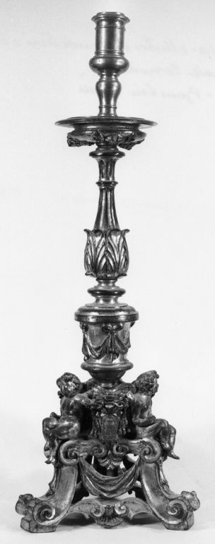 Base poggiante su piedini a volute; fusto interrotto da nodi; piattello; sgocciolatoio. Sulla base angioletti alternati a stemmi