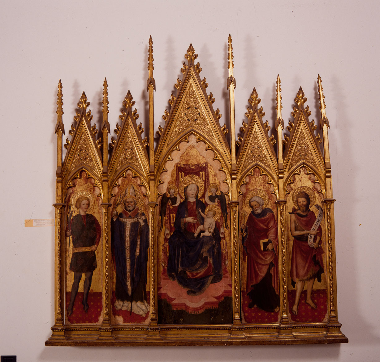 - NOTIZIE STORICO CRITICHE E' ignota la destinazione originaria del polittico già attribuito a Jacopino Cietario dal Van Marle (1927). Fu Longhi (1928) a definirlo di maniera milanese datandolo intorno al 1450 ed avanzando l'attribuzione agli Zavattari confermata da Baroni e Samek (1952) e nuovamente da Longhi nel 1957, il quale in tale occasione accostò il polittico agli affreschi con storie di Teodolinda (Duomo di Monza, firmati e datati dagli Zavattari nel 1444). Grazie alla Algeri (1981) è noto che in un documento datato 17 dicembre 1459 Ambrogio Zavattari fu pagato per un polittico destinato all'altare maggiore del Duomo di Milano. Pertanto la presenza nel polittico di Castel Sant'Angelo di due santi (Vittore e Ambrogio) venerati a Milano farebbe pensare all'opera destinata al Duomo milanese. Ma secondo la Ghidoli (1984) si potrebbe ipotizzare la destinazione per la chiesa milanese di S. Pietro in Gessate, affidata nel 1433 ai monaci di S. Giustina da Padova poi detti Cassinesi. Al suddetto ambito monastico farebbero infatti riferimento i santi Antonio Abate (padre del monachesimo occidentale) e Benedetto. Per la stessa Ghidoli il polittico è attribuile a più personalità della prima e della seconda generazione della famiglia Zavattari (Cristoforo, Francesco, Ambrogio, Giovanni, Gregorio) e la datazione dovrebbe essere spostata ad oltre la metà del 1400. Per quanto riguarda la storia conservativa, l'opera giunse a Castel Sant'Angelo privata dei due scomparti con S. Antonio Abate e S. Benedetto (che nel 1957 Longhi individuava in una collezione privata) acquistati successivamente. In precedenza, già smembrato, fece parte della collezione del Conte di Torino Vittorio Emanuele Savoia-Aosta (Longhi, 1957) come è confermato dal bollino presente sulla cornice ottocentesca in stile gotico con la quale pervenne nella collezione Contini e poi nel Museo di Castel Sant'Angelo