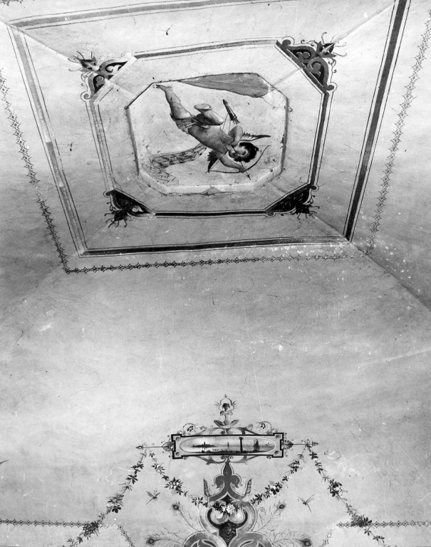 Volta a crociera ornata al centro di ciascun lato da ornati a volute, piume di pavone e piccoli insetti culminanti in rettangoli contenenti quattro paesaggi diversi dal disegno minuzioso. Al centro della volta: Cupido. Colori vivaci con predominanza di giallo oro e azzurro