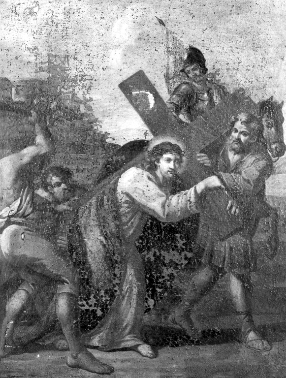 Personaggi: Gesù Cristo; Simone il Cireneo. Figure: carnefici; soldati. Armi: lancia. Animali: cavallo. Strumenti del martirio: corona di spine; croce