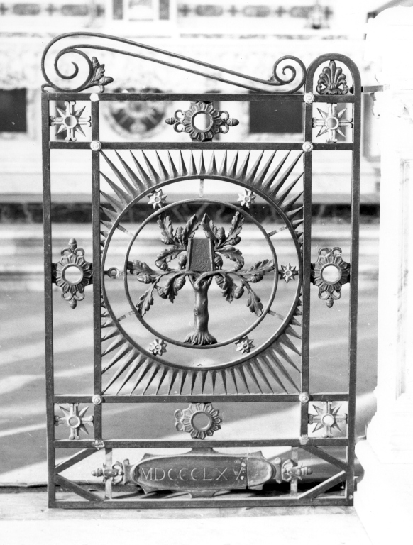 Base con cornici scolpite. Estremità: pilastrini a sezione quadrata con fronte a piattabanda incorniciata e capitello corinzio sovrapposto. Sequenza di balaustri con nodo a treccia. Cancelletto in ferro battuto