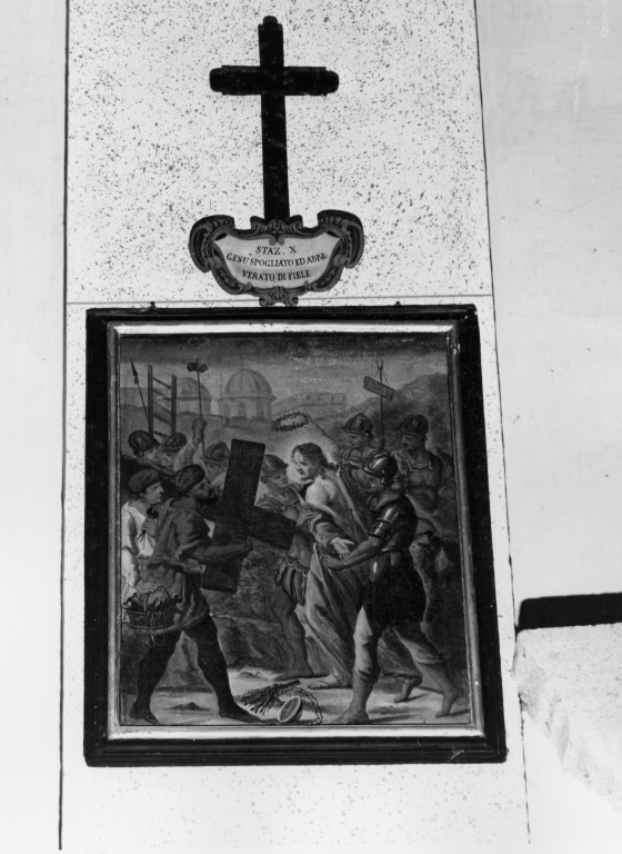Dipinto riquadrato da cornice modanata di legno profilata d'oro all'interno, croce sommitale e cartiglio indicante la stazione relativa