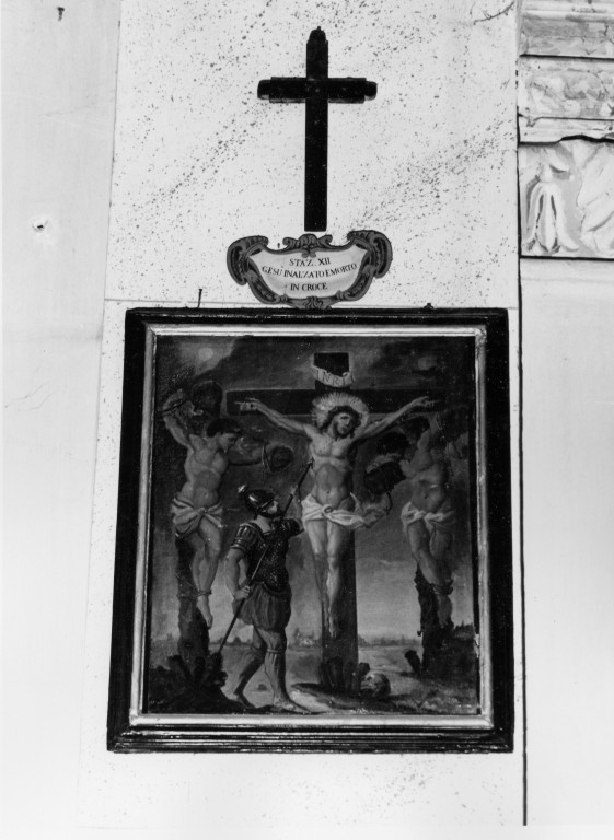 Dipinto riquadrato da cornice modanata di legno profilata d'oro all'interno, croce sommitale e cartiglio indicante la stazione relativa